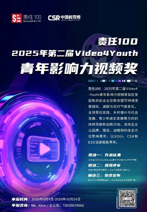 为全面提升优秀企业品牌的青年影响力,责任100组委会于9月1日启动“责任100|2025年第二届Video4Youth青年影响力视频奖”,聚焦企业在联合国可持续发展目标、减碳与应对气候变化、全球责任实践、乡村振兴与社会发展、青少年成长发展等方向的持续贡献和创新行动,支持企业以品牌、理念、战略和科技全方位影响青年,以SDGs、CSR和ESG深度赋能青年。截至目前,已有30+企业参与申报,17家企业成功入围。