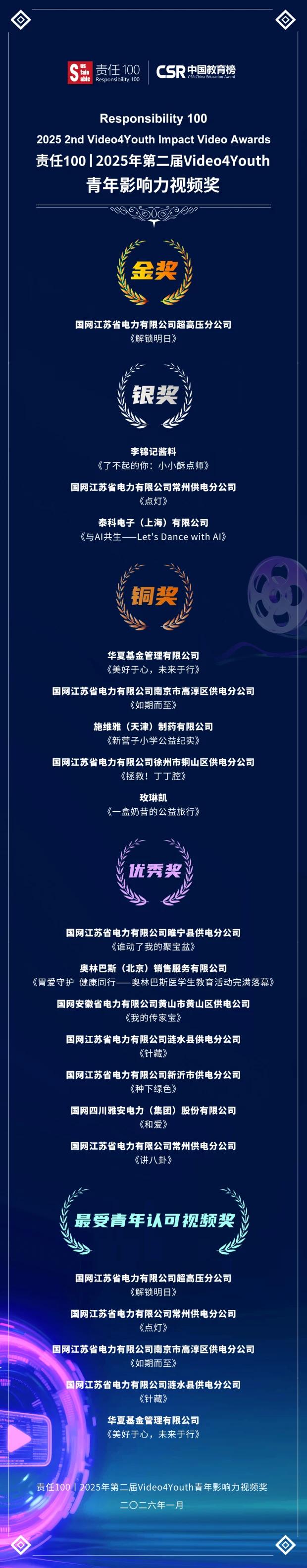2026年1月15日,“责任100|2025年第二届Video4Youth青年影响力视频奖”获奖名单正式发布,经专家委员会评审,共计评选出1个金奖、3个银奖、5个铜奖、7个优秀奖。其中,国网江苏省电力有限公司超高压分公司《解锁明日》获得金奖;李锦记酱料《了不起的你:小小酥点师》、国网江苏省电力有限公司常州供电分公司《点灯》、泰科电子《与AI共生--Let’s Dance with AI》获得银奖。