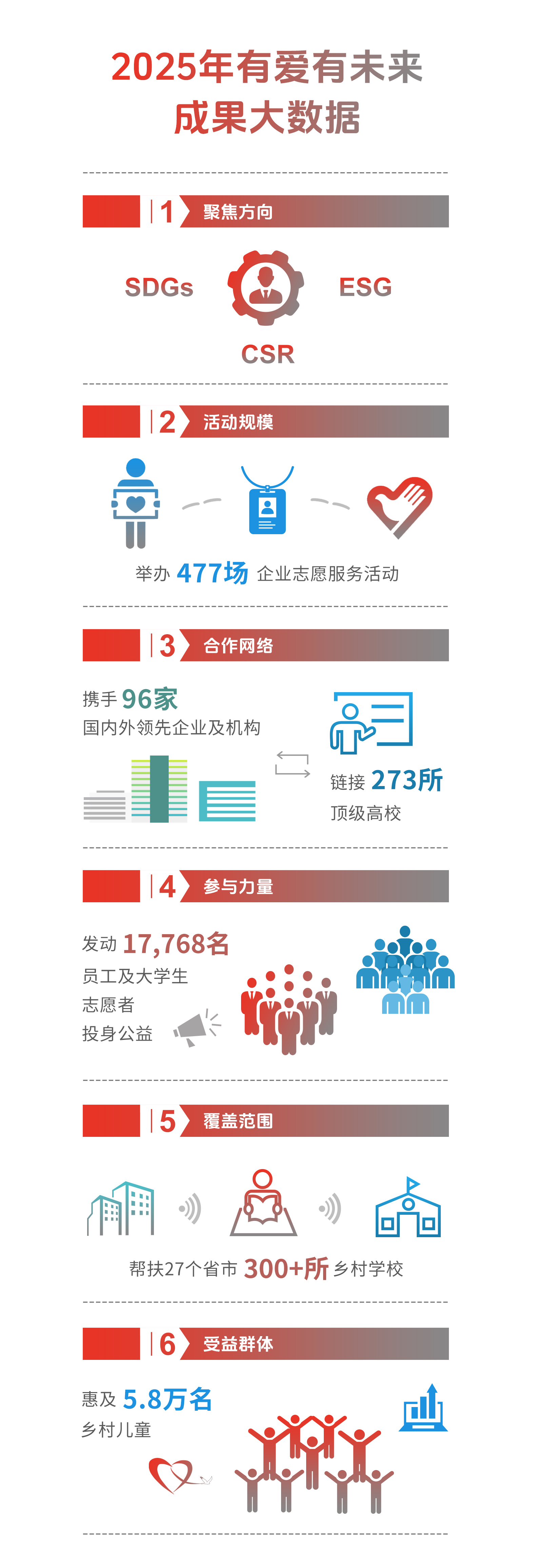 2025年,有爱有未来企业志愿行动积极响应联合国可持续发展目标(SDGS),深度聚焦优质教育(SDG4)与气候行动(SDG13)议题,携手96家国内外领先企业和机构,开展477场志愿服务活动,超过1.7万名志愿者参与,共同践行企业CSR和ESG责任,助力国家“双碳”战略与教育强国建设,探索可持续、可衡量的公益实践范式。