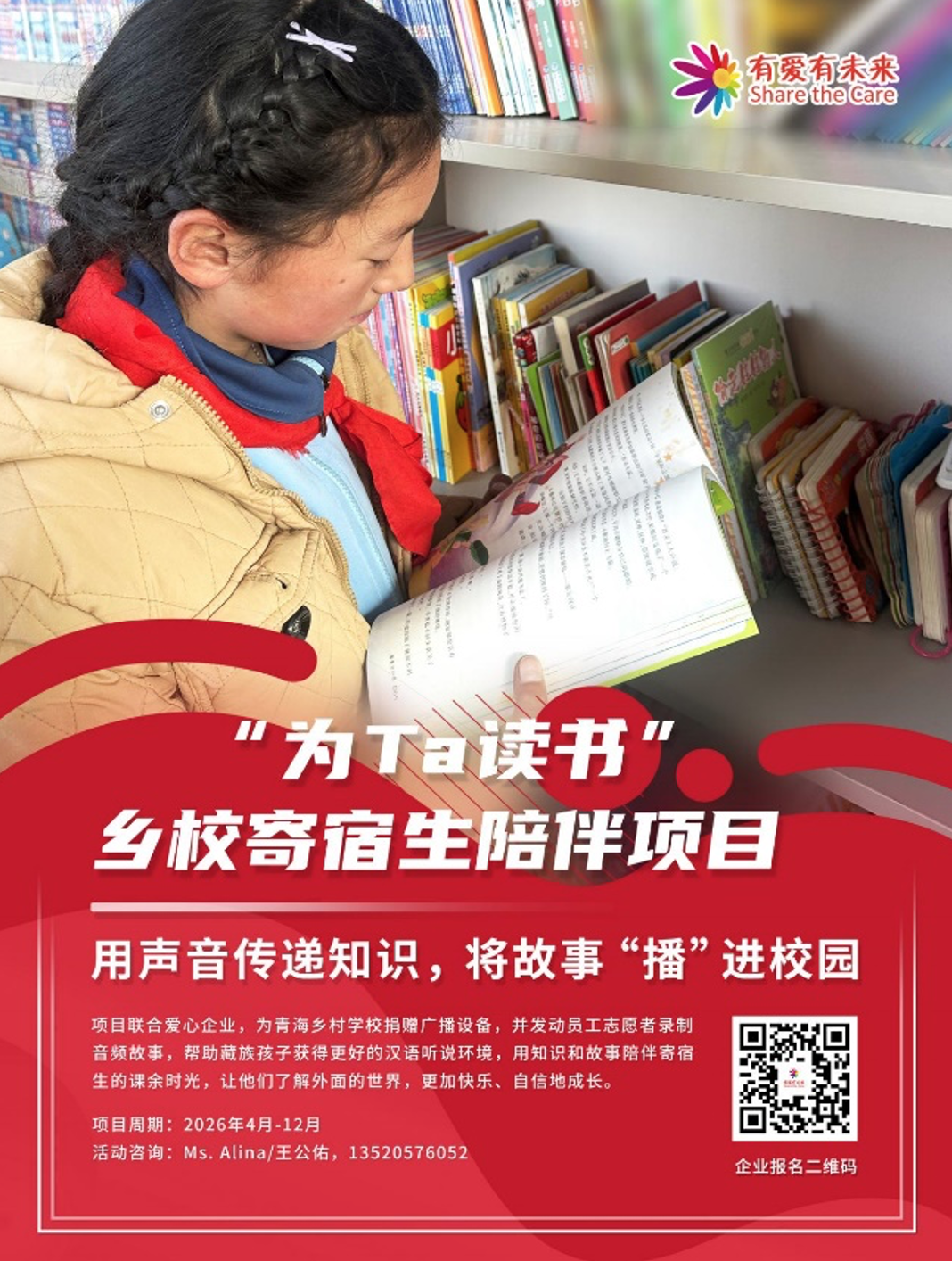在此基础上,有爱有未来于2026年正式推出“为Ta读书”乡校寄宿生陪伴项目,联合爱心企业为青海玉树乡村寄宿学校捐赠广播设备,并发动员工志愿者录制音频故事,帮助藏族孩子获得更好的汉语听说环境,并用知识和故事陪伴寄宿生的课余时光。