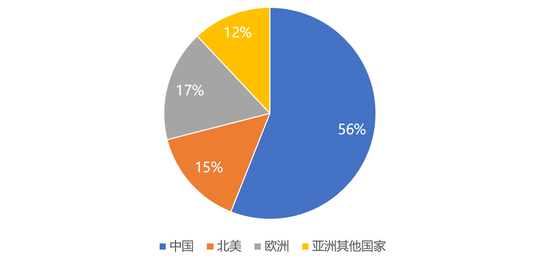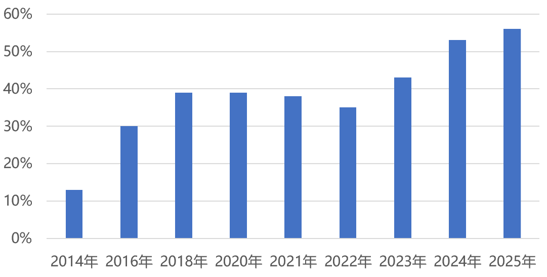 2014年占比为13%,2016年占比为30%,2018年及2020年占比均为39%,2021年占比为38%,2022年占比为35%,2023年占比为43%,2024年占比为53%,2025年占比增加至56%,保持稳步增长。