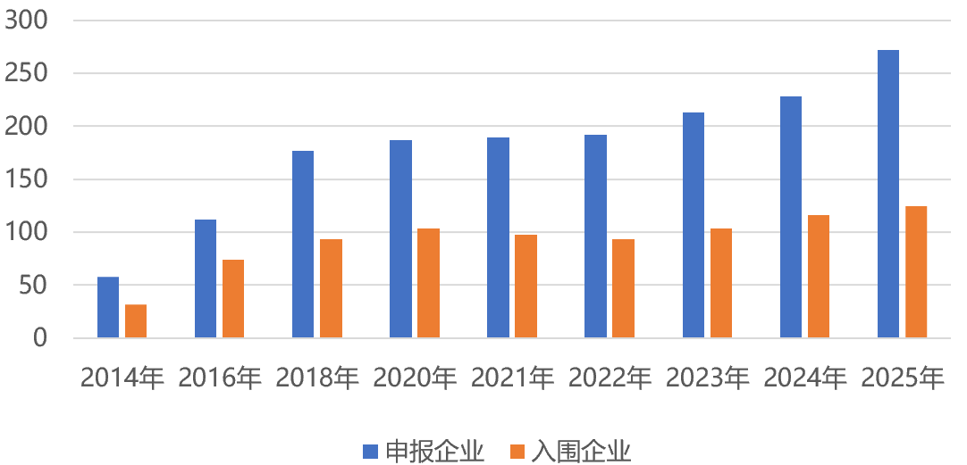 ①参与率持续提升,入围率保持稳定:2022年共192家企业申报、93家企业入围,入围率为48%;2023年共213家企业申报、103家企业入围,入围率为48%;2024年共228家企业申报、117家企业入围,入围率为51%;2025年共272家企业申报、124家企业入围,入围率为46%,显示出企业对社会责任认证的认可度不断提升。