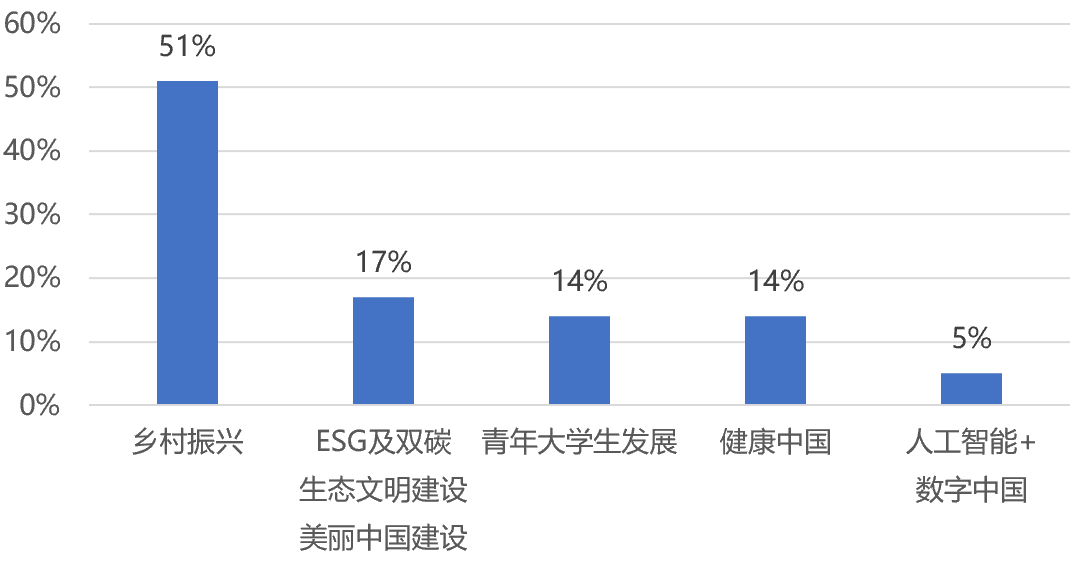 ①乡村振兴项目领先:在与国家政策密切相关的项目中,乡村振兴项目以占比51%位列第一,主要包含乡村教育、经济发展、健康服务、文化传承等方向。这一高占比与近年来国家全面推进乡村振兴战略紧密相关,企业积极响应政策号召,将资源投向农村地区,助力缩小城乡发展差距。