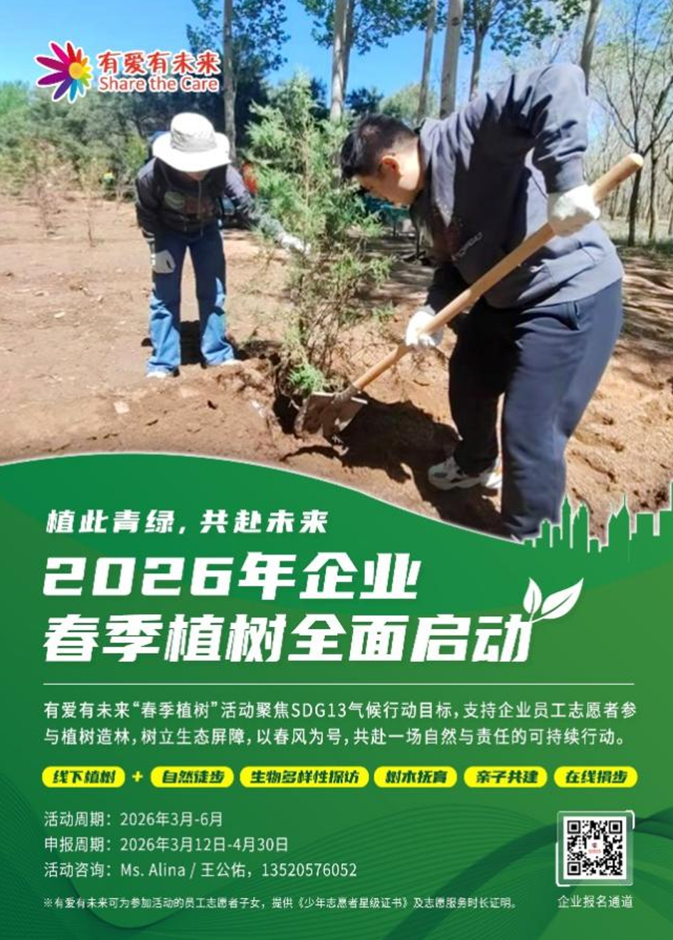 有爱有未来“春季植树”活动于每年3月-6月开展,支持企业员工志愿者参与线下植树,建立专属“企业公益林”,深度践行ESG环境责任。截至2025年,累计超过4.7万人次参与,植树8,482棵。这不仅是一场植树造林,更是融合了生物多样性探访、树木抚育、亲子共建的自然体验之旅。